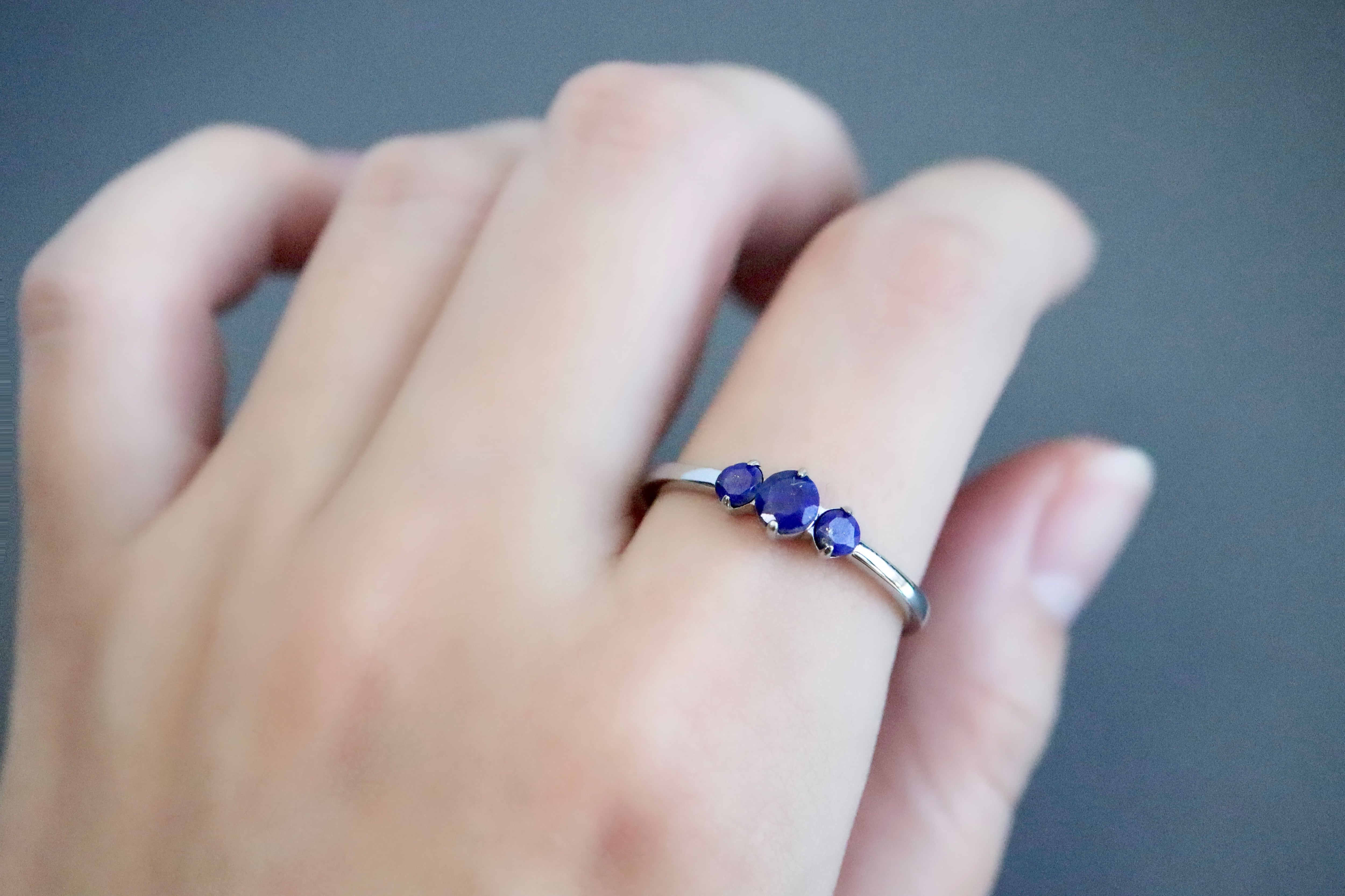 夜空を石に映したような天然石のラピスラズリを使用したリングです。深いネイビーブルーに金彩が混ざった美しいカラーです。濃さや色の混ざりはひとつひとつ異なります。